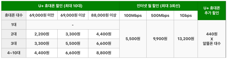 예를 들어, 69,000원 미만의 U+ 휴대폰 2대와 U+알뜰폰 2대를 결합할 경우 2회선 혜택이 적용되어 U+ 모바일 한대당 440원, 총 3,080원을 할인받을 수 있습니다.